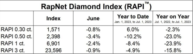 6 月份,1 克拉成品钻的 RapNet 钻石指数(RAPI™)下跌了 2.4%。7月 1 日为 6901 点,年初为 7537 点。RAPI 在其他尺寸上也有所下降,并在7 月的前四天继续下降。质量更好的 0.5 克拉和 1 克拉钻石价格同比下降23%以上。成品钻库存仍然很高,但由于产量低而保持稳定。印度的工厂延长了