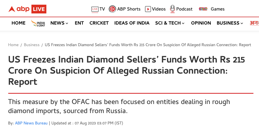 不过美国方面确实正在“越来越努力地”制裁俄罗斯(及该国的钻石)。7月20日,Alrosa新任CEO马里尼切夫(Pavel Marinychev)被美国列入了新一轮的制裁名单,OFAC(海外资产控制办公室)前几天更是冻结了一批印度珠宝商的跨境公司转账(总2600万美元左右),因为这些公司被认为和俄罗斯方面有供销往来。(新闻截图如下)