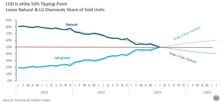 与此同时,培育钻石裸钻在市场总销量中的占比已经极其接近50%。