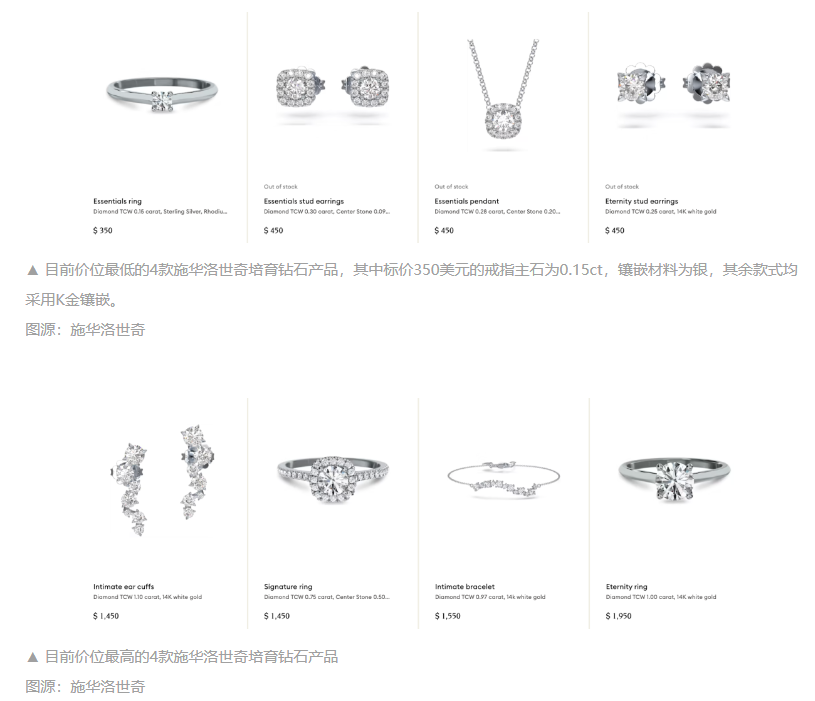 我们目前可以在施华洛世奇官网(美国版)看到22款培育钻石相关产品,其价位在350~1950美元之间(如下图)。