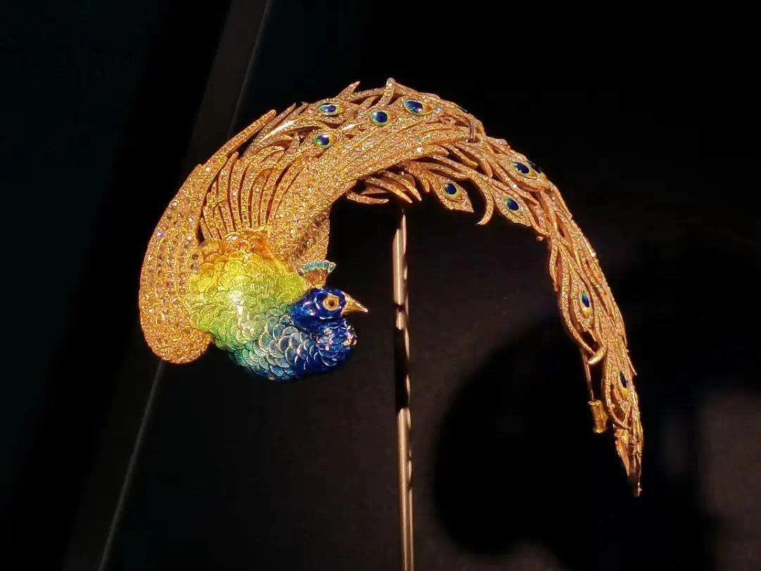 记者了解到,这是珠宝艺术史中最为著名的设计之一,曾经在英国维多利亚与阿尔伯特博物馆、故宫博物院、美国大都会博物馆作为明星展品展出。1905年,法国王室御用珠宝世家麦兰瑞,接受了印度卡普塔拉大君贾加吉特·辛格的委托,制作了这件传奇的孔雀珠宝——通体施以珐琅,上嵌1742颗玫瑰式切割钻石,还原出孔雀周身羽毛的流光溢彩。
