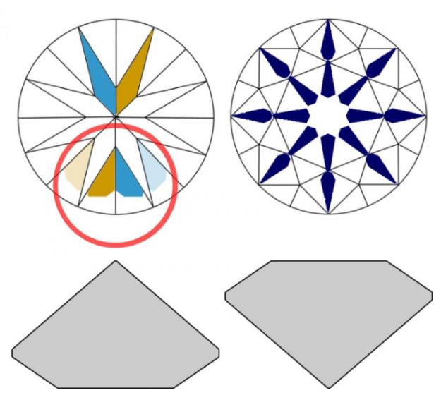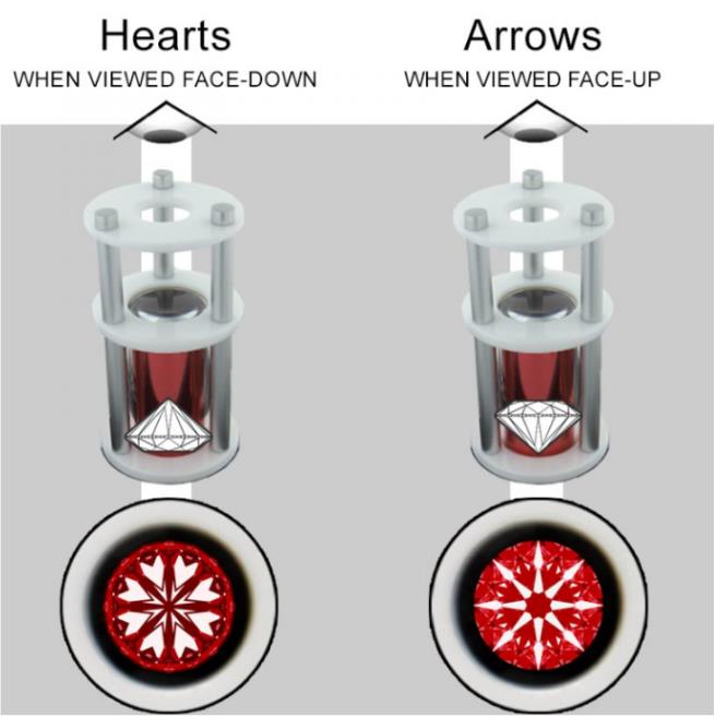 八心八箭历史:在20世纪80年代,日本的钻石切割工首次生产出切割得非常精确的圆形明亮型钻石,使钻石的刻面反射在3D空间中发生重叠。当观察者使用反射镜,可以看到一致形状的图案。这些抛光工人据说使用“秘方”创建出了八心八箭:从亭部可看到的“心”和从冠部看到“箭头”——都是由八个亭部主刻面反射形成。(下方用红圈标出)
