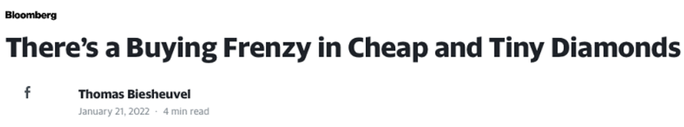 但是从最近几个月的情况来看,原本不起眼的小碎钻却出现了史无前例的大幅度涨价,上游两大巨头(戴比尔斯和埃罗莎)相当默契地先后调高了小颗粒毛坯的价格,下游的成品钻报价表也随之作出了更新。1月21号,彭博社的托马斯默默地敲出了一行字:“市场正在抢购廉价的小钻石”。