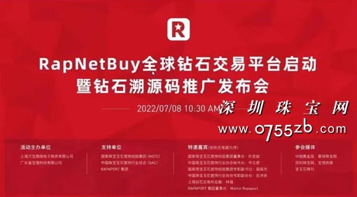 2022年7月8日,RapNetBuy启动仪式暨钻石溯源码推广发布会在腾讯会议隆重举行。中国珠宝玉石首饰行业协会会长、国家珠宝玉石首饰检验集团党委委员、书记、董事长叶志斌先生、中国珠宝玉石首饰行业协会副会长、秘书长毕立君先生、中国珠宝玉石首饰行业协会监事长、国家珠宝玉石首饰检验集团党委委员会、专职副书记、董事梁振杰先生、中国珠宝玉石首饰行业协会专职副会长史洪岳先生、上海钻石交易所总裁林强先生、RAPAPORT集团董事长MartinRapaport先生以及来自全国100多家品牌代表嘉宾受邀出席腾讯线上发布会大厅。